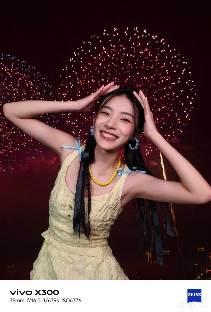 针对一些特别的夜景人像拍摄场景,比如烟花场景,vivo X300还带来了行业首创的闪光烟花人像,在夜色的烟花光影交织下,清晰记录烟花的绚烂瞬间和动人的人像效果,它还支持动态照片拍摄,让烟花与人像之美更生动,更有生命力。前置蔡司50MP超清AF镜头,不仅能快速对焦人脸,实现高效出片,而且在多人合拍时也无惧边缘人脸畸变,加上vivo自然美颜算法,自拍效果更出众。