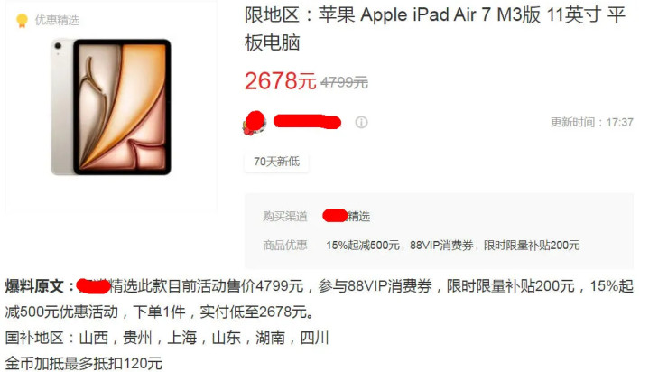 根据张大妈17点37分的爆料,某猫原价4799元的iPad Air7 M3版(11英寸/128G版),通过限时补贴和国家补贴等多重优惠后,实付低至2678元,其中国补地区有山西、贵州、上海、山东、湖南和四川这六大省份,覆盖面较广。
